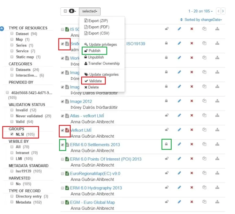 Þegar ekki er búið að gefa lýsigögn út, er lásinn við skráninguna lokaður (sjá mynd hér fyrir ofan). Hægt er að gefa þau út með því að haka við lýsigögnin (eina skráningu eða fleiri) og velja svo úr fellilistanum Publish. Þá opnast lásinn sem þýðir að þau eru útgefin. Muna að „refresha“ þegar breytingar eru gerðar vegna þess að allar svona breytingar sjást ekki fyrr en það hefur verið gert. Þetta á reyndar við um fleiri aðgerðir.