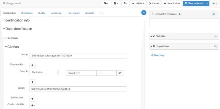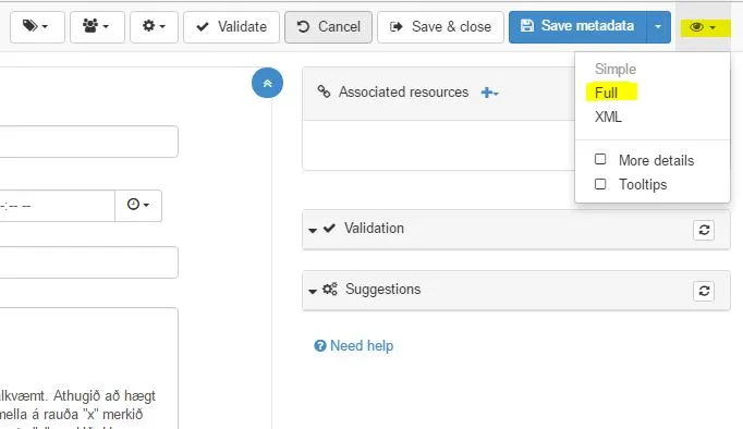 Mælt er með að byrja á að skrá í stjörnumerktu reitina. Athugið að hægt er að eyða út þeim reitum sem nýtast ekki í skráningunni með því að smella á rauða „x“ merkið hjá reitunum sem birtist bara þegar farið er yfir skjáin með bendlinum og sést því ekki á myndinni hér fyrir neðan. Einnig er hægt að bæta við reitum með því að smella á svarta „+“ merkið sem er víða í forminu. Hvoru tveggja getur hins vegar orðið til þess að lýsigögnin komist ekki í gegnum „validate“ ferlið (hnappur á stikunni efst). Því er mælt með að byrja á að skrá í stjörnumerktu reitina og eyða ekki strax út. Það er alltaf hægt að byrja upp á nýtt, eyða skráningunni og ná aftur í sniðmátið.