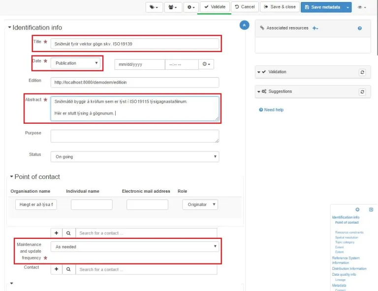 Athugið að hægt er að eyða út þeim reitum sem nýtast ekki í skráningunni með því að smella á rauða „x“ merkið hjá reitunum sem birtist bara þegar farið er yfir skjáin með bendlinum og sést því ekki á myndinni hér fyrir neðan. Einnig er hægt að bæta við reitum með því að smella á svarta „+“ merkið sem er víða í forminu. Hvoru tveggja getur hins vegar orðið til þess að lýsigögnin komist ekki í gegnum „validate“ ferlið (hnappur á stikunni efst). Því er mælt með að byrja á að skrá í stjörnumerktu reitina og eyða ekki strax út. Það er samt alltaf hægt að byrja upp á nýtt, eyða skráningunni og ná aftur í sniðmátið.