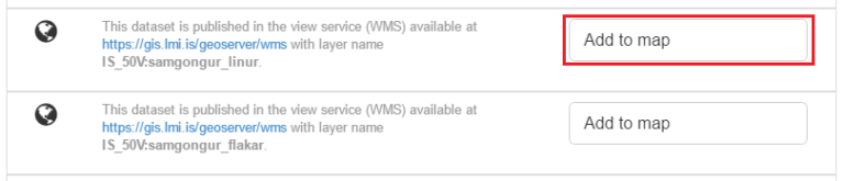Gögnin ættu einnig að birtast á kortinu í Geonetwork. Smellt er á Add to map: