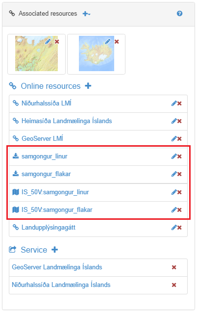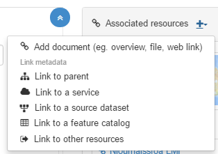 Ef ekkert er búið að tengja er listinn tómur en til að tengja við mismunandi tegundir af tengdu efni er smellt á plúsinn við hlið Associated resources. Í þessum kafla verður einungis fjallað um wms eða wfs þjónustur. Þegar smellt er á plúsinn þá birtist þessi listi: