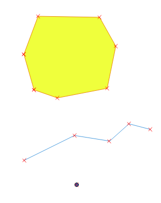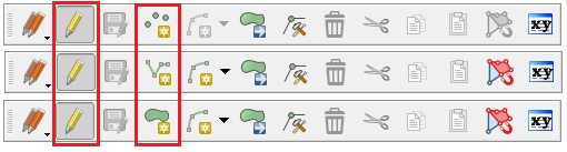 Einnig er hægt að kveikja á breytingaham með því að velja blýantinn á Digitizing Toolbar. Þessi tólastika er eins fyrir allar tegundir af skrám fyrir utan búa til nýtt fyrirbæri hnappinn, í tilfelli punkta birtast þrír punktar, línu birtist lína og fláka eru það flákar. Myndin hér að neðan sýnir Digitizing Toolbar punkta, lína og fláka sem búið er að líma saman í eina mynd til þess að sýna muninn á þeim.