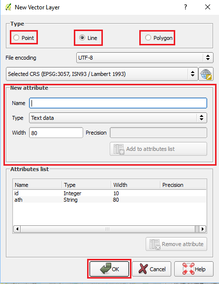 Næst kemur upp New Vector Layer valmyndin. Nú þarf að velja hvort búa eigi til punkta, línur eða fláka, en það er valið undir Type. Það er auðvelt að búa til eigindadálka sem fylgja shape skránum, en dæmi um eigindi eru nafn eða tegund. Eigindadálkar geta verið af ýmsum tegundum t.d. texti, tölur, tölur með aukastöfum. Þegar bæta á eigindadálki við skrána sem verið er að búa til er nafn eigindadálksins skráð undir Name, tegund hans undir Type og í Width er skráð lengd dálksins, t.d. 80 stafir. Hægt er að bæta við eigindadálkum eftir að skrá hefur verið búin til, en því verður ekki lýst í þessari æfingu. Þegar búið er að búa til þá eigindadálka sem eiga að vera í skránni er OK valið og við það opnast valgluggi þar sem hægt er að ákveða hvar skráin á að vera vistuð. Nú á skráin að birtast í LayersPanel glugganum sem oftast er til vinstri á kortaglugganum.
