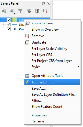 Þegar búið er að búa til punkta línu eða flákaskrá er hægt að byrja að breyta henni, en til þess er hægri smellt á skrána sem á að breyta og Toggle Editing valið.