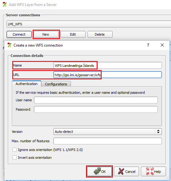 í QGIS valið í tólastikunni til vinstri og við það opnast Add WFS Layer from a Server valmynd. Eins og í tilfelli WMS og WMTS er New valið, við það opnast nýr valmynd Create new WFS connection. Nú þarf að setja inn nafn að eigin vali undir Name og URL þjónustunnar er slegið inn, til þess að loka glugganum er Ok valið.