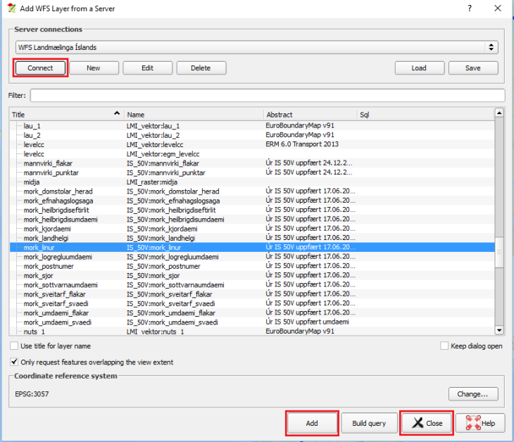Næst er að tengjast þessum nýju þjónustum, en það er gert með því að velja Connect, við það birtist listi yfir þau lög sem í boði eru. Þegar búið er að velja lag eða lög við hæfi með því að smella á þau þannig að þau verði blá er þeim bætt við kortagluggan með því að velja Add, nú er hægt að loka glugganum með Close og skoða lögin sem opnuð voru.