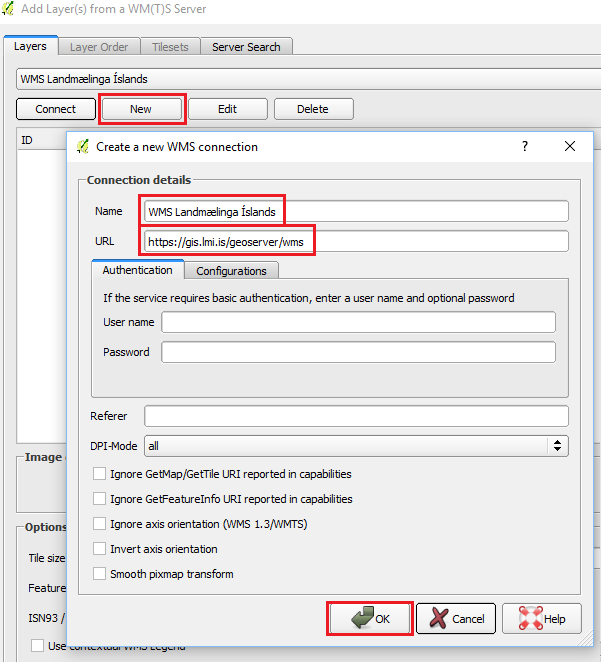 í tólastikunni til vinstri valið, við það opnast Add Layer(s) from a WM(T)S Server valmyndin. Til þess að búa til nýja tengingu er New valið, við það opnast önnur valmynd þar sem gefa þarf inn nafn undir Name, en þar má setja inn hvað sem er, en nafnið er hugsað fyrir notandann til þess að hafa skipulag á þeim þjónustum sem hann tengist. Einnig þarf að gefa upp URL þjónustu sem á að tengjast. Þar sem þjónustur LMÍ eru opnar þarf ekki að setja inn notendanafn eða lykilorð, en til þess að halda áfram er OK valið og við það lokast seinni valmyndin.