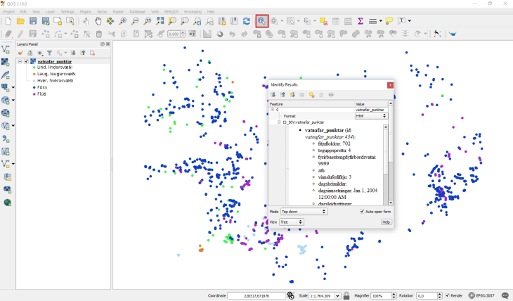 Nú eru gögnin komin í kortagluggann. Hægt er að fá upplýsingar um gögnin með því að velja i (information) hnappinn og smella svo á gögnin í kortaglugganum.