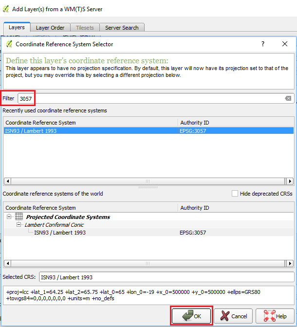 Hægt er að stilla QGIS hugbúnaðinn þannig að viðkomandi hnitakerfi sé sjálfvalið. Við það að smella á Change… birtist ný valmynd. Best er að fara beint í filter og slá inn 3057 þá birtist ISN93 hnitakerfið og til þess að velja það þarf að smella á textann og við það litast reiturinn blár. Til þess að loka kassanum aftur er farið í OK.
