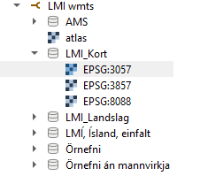 Þegar búið er að velja OK er hægt að velja þjónustuna og þá birtist listi af lögum og hnitakerfi sem í boði eru. Til þess að WMTS kortin séu hraðvirk og falleg er mikilvægt að kortaglugginn sé stilltur á sama hnitakerfi og WMTS þjónusturnar í boði eru. Eins og sjá má á myndinni hér að neðan að allar þjónusturnar að bjóða upp á EPSG:3057, en það er einmitt númerið fyrir ISN93. Hægt er að fá nánari upplýsingar um EPSG númerin hér. Nú er bara að velja þjónustu við hæfi með því að tvísmella.