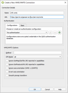 Til þess að slóðin sé ekki skrifuð vitlaust er ágætt að afrita linkinn hér: https://gis.lmi.is/geoserver/gwc/service/wmts?SERVICE=WMTS&REQUEST=GetCapabilities eða í nýrri útgáfum þá er nóg að gefa https://gis.lmi.is/geoserver/gwc/service/wmts